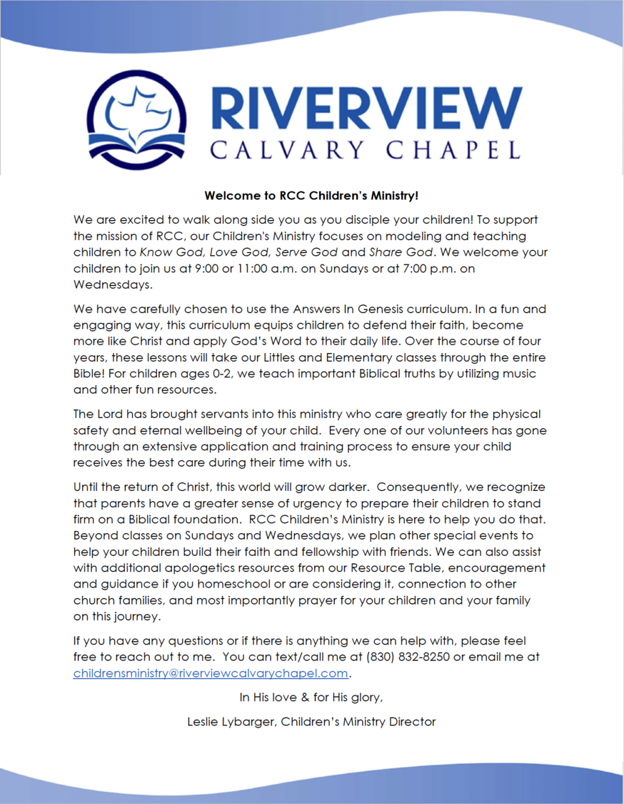 We're excited for your children to be a part of our children's ministry! We desire the kids to learn the Bible at an age appropriate level, have fun and build friendships with children their age. We want to share the love of Jesus and the message of the Bible to children and plant seeds in their hearts that will blossom into a beautiful relationship with Jesus Christ, as they grow closer to Him.